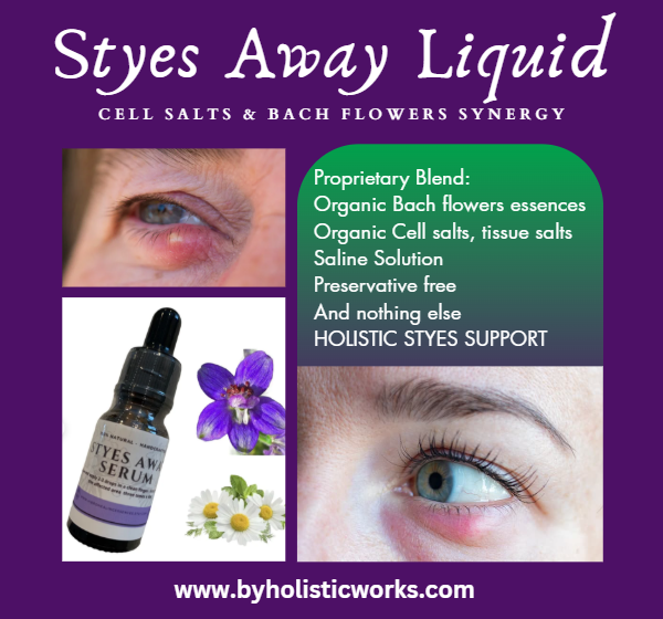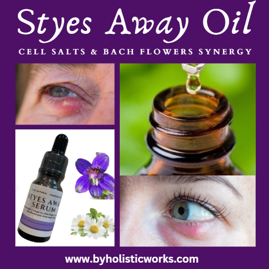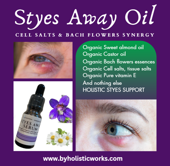 Natual styes treatment. 100 % plant based oil. Chalazion natural support. blepharitis, inflammation. Orzuelo tratamiento natural. Cell salts & Bach flowers therapeutic synergy.